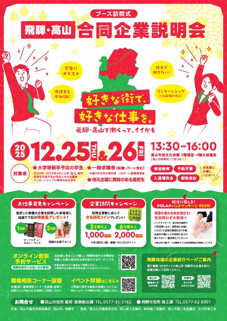 「飛騨・高山合同企業説明会」(12月25日)に参加します 2025年11月18日 最終更新日時 : 2025年11月18日 okamuray 「飛騨・高山合同企業説明会」が12月25・26日に高山市民文化会館で開催されます。 大学・短大・専門学校等の新卒予定の学生の方や転職・パート希望の一般求職者の方は勿論ですが、地元企業に興味のある高校生の方も対象です。 当社の仕事内容や雰囲気などを聞いてみたい方、どんな会社なんだろうと興味のある方など、この機会に是非お気軽にご参加下さい 当社エレクスは、12月25日(木) 3階(3-11講堂)12番ブースでお待ちしております。